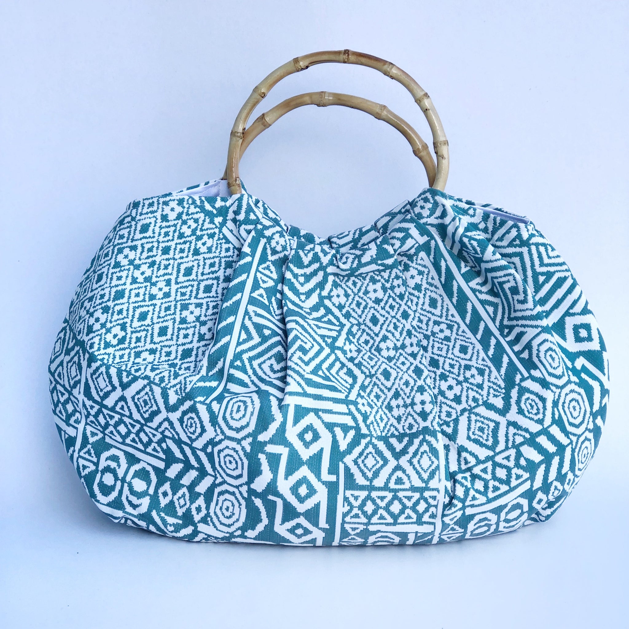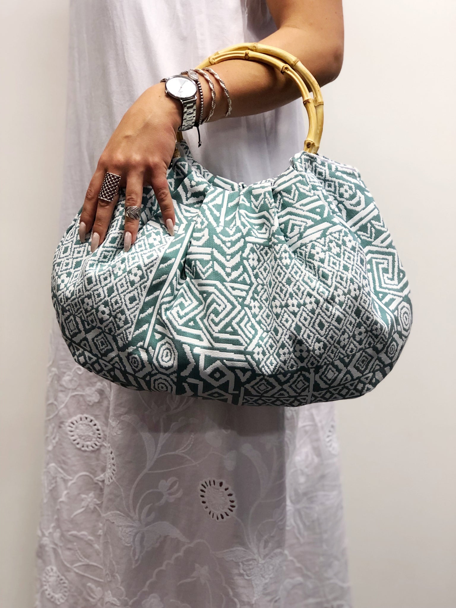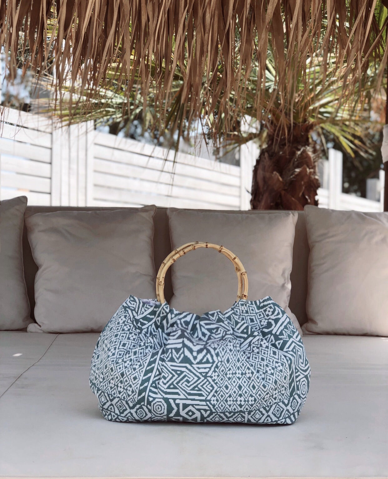 Τσάντα με στρογγυλό μπαμπού χερούλι, φοδραρισμένη εσωτερικά και μαγνητικό κούμπωμα κλιπ. Συνοδεύει όλες τις καλοκαιρινές σας εμφανίσεις δίνοντάς τους χρώμα και στυλ κατά τη διάρκεια της ημέρας στην πόλη η το νησί.